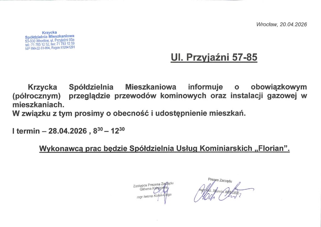 Przegląd przewodów kominowych i instalacji gazowej ul. Przyjaźni 57-85- I termin.